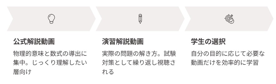 公式解説動画では、なぜその式が成り立つのか、どういう物理的イメージなのかを丁寧に説明します。一方、演習解説動画では、実際の問題をどう解くのか、どこでつまずきやすいのかに焦点を当てています。この分離により、学生さんは自分の目的に応じて必要な動画だけを選んで視聴できるようになります。